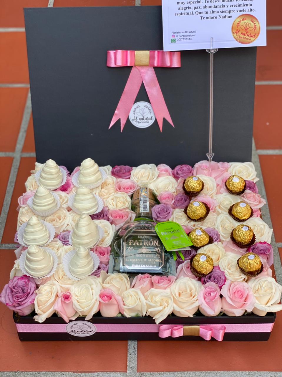 Arreglo floral al natural de cumpleaños #02 caja decorativa con rosas de 2 tonos , chocolate ferrero x 8 , fresas con chocolate, tequila patron.
