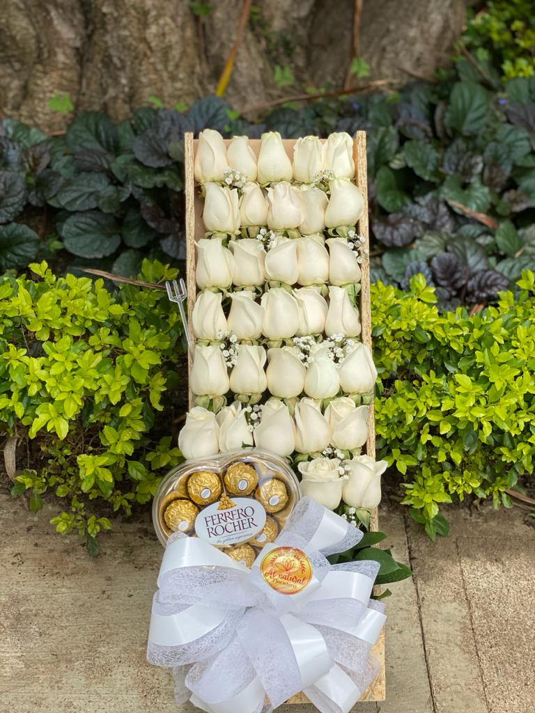 Arreglo floral al natural de cumpleaños # 36 arreglo floral de rosas blancas y chocolates ferrero