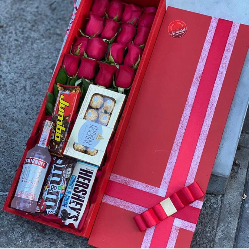 Arreglo Floral al natural para Toda Ocasión #  25 arreglo floral con rosas rojas, chocolates ferrero, chocolatina jumbo, choccolatina hershey,chocoolates mym  y cerveza smirnoff,